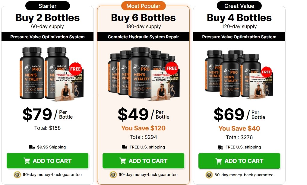 In a typical AlphaFuel Pro Reviews, pricing is an important factor for buyers. AlphaFuel Pro is usually available in multiple package options. A single bottle comes at a standard price, making it a suitable option for beginners who want to try the product first. However, bundle packages offer better value, as they reduce the cost per bottle. These multi-bottle deals are often preferred by users planning long-term use, since consistency is key for noticeable results.